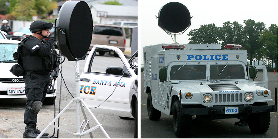 1) Le 1er exemple d'armes électromagnétiques rendues publiques et utilisées actuellement par les militaires et la police pour contrôler et disperser les foules lors de conflits armés ou de manifestations de civils : « Active Denial System » ou « ADS ». Page 15