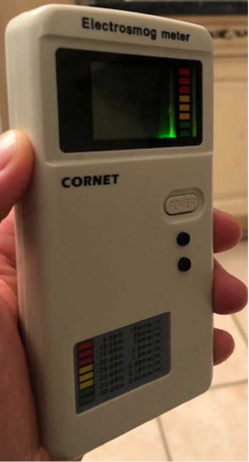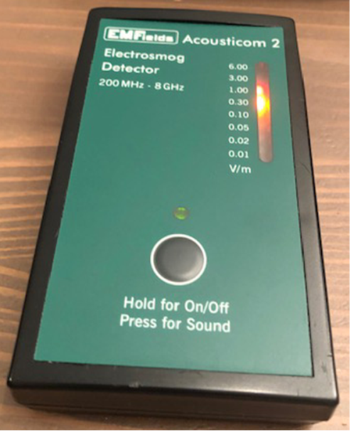 EM Fields Acousticom 2 EMF detector (mesure intensités des champs électromagnétiques de hautes fréquences de 200 MHz à 8 GHz) : https://tinyurl.com/5n7ptvbw